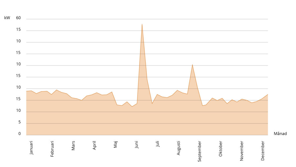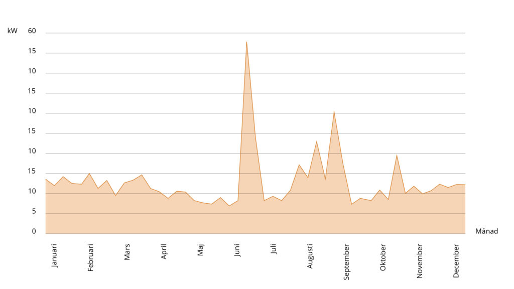 OBS att effekttoppen definieras som elenergianvändningen (kWh) under en timme (h). Så korta effekttoppar (strömtoppar) påverkar inte timregistreringen i någon högre grad.
